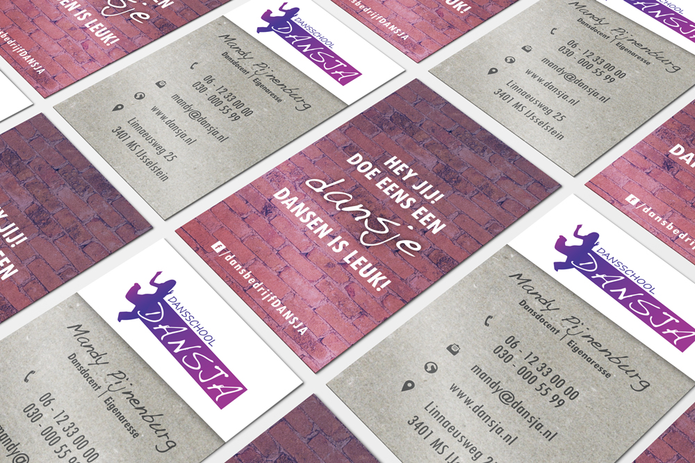 Voor Dansschool Dansja is een complete huisstijl gemaakt met het bestaande logo. Een dansschool moet plezier uitstralen, daarom is gekozen om vrolijke aansprekende teksten te gebruiken als "Hey jij! Doe eens een dansje. Dansen is leuk!" De paarse kleur is gecombineerd met een bakstenen muur als achtergrond om een stoere look te krijgen. Deze stijl is vervolgens overal doorgevoerd: een nieuwe website, visitekaartjes, flyers en meer.